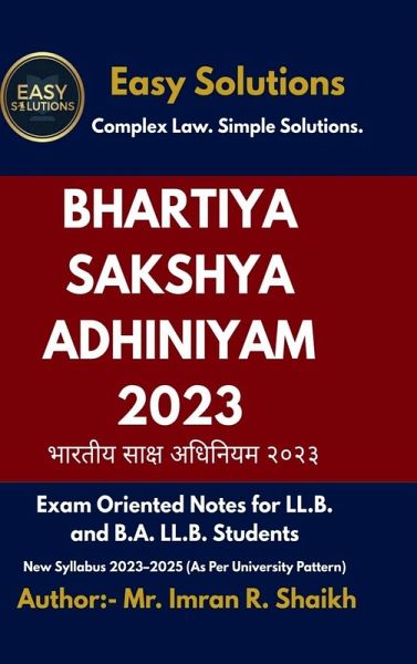 Bhartiya Sakshya Sanhita 2023 is a student-friendly, exam-oriented guide to India's newly introduced Evidence Law. Structured in a question-answer format, this book simplifies complex legal concepts into clear, concise explanations that are easy to understand and retain. Whether you're a law student, judiciary exam aspirant, or a legal educator, this book offers a practical and accessible approach to mastering the key provisions of the Bhartiya Sakshya Sanhita. It covers frequently asked questions, likely exam topics, and essential legal definitions aligned with the updated legislation. Written by Mr. Imran R. Shaikh, an experienced academic with degrees in History, Politics, Sociology, Law, and Human Resource Management, the book combines academic depth with teaching clarity. His insights and classroom experience bring real-world relevance to every answer.