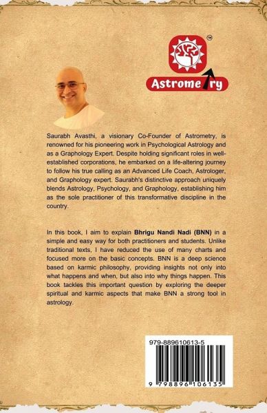 Bhrigu Nandi Nadi: Astrology Simplified Dive into the timeless wisdom of Bhrigu Nandi Nadi (BNN), an astrological masterpiece that demystifies the cosmic influences shaping our lives. This comprehensive guide introduces readers to a rich tradition of predictive astrology, setting it apart from traditional Vedic methods through unique techniques for interpreting the intricate relationships between planets, houses and signs. With practical insights on interpreting planetary combinations, transits and the karmic significance of each planet, this book makes BNN accessible and applicable to modern readers. Through clearly organized chapters on each celestial body, zodiac sign and house, you'll discover how BNN explains why we are born, our life purpose and the events we encounter. The book also delves into the influences of planetary alliances, transits and retrogrades, revealing profound insights into our personal and professional lives, health, wealth and relationships. Whether you are a seasoned astrologer or a newcomer, Bhrigu Nandi Nadi: Astrology Simplified is an essential resource for understanding the spiritual and practical dimensions of astrology, empowering you to explore life's mysteries with confidence.
