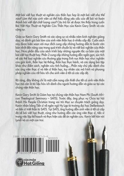 M¿t bài vi¿t h¿c thu¿t và nghiên c¿u th¿n h¿c hay là m¿t bài vi¿t nh¿ th¿ nào? Câu tr¿ l¿i s¿ ¿¿¿c tìm th¿y trong cu¿n Bài Vi¿t H¿c Thu¿t và Nghiên C¿u Th¿n H¿c c¿a Kevin Gary Smith và các c¿ng s¿. Cu¿n sách này ¿¿¿c biên sön v¿i m¿c ¿ích cung c¿p nh¿ng h¿¿ng d¿n chu¿n b¿ và vi¿t bài nghiên c¿u th¿n h¿c t¿ b¿¿c c¿n b¿n nh¿t ¿¿n nâng cao. N¿a ph¿n ¿¿u c¿a sách trình bày nh¿ng nguyên t¿c c¿ b¿n c¿a m¿t bài vi¿t h¿c thu¿t hay. Ph¿n 2 cung c¿p nh¿ng h¿¿ng d¿n ng¿n g¿n, súc tích v¿ các th¿ löi nghiên c¿u th¿¿ng g¿p trong l¿nh v¿c th¿n h¿c nh¿: nghiên c¿u gi¿i kinh, th¿n h¿c h¿ th¿ng, th¿n h¿c th¿c hành, và các d¿ng bài t¿p khác nh¿ ¿i¿m sách, nghiên c¿u tình hu¿ng,...Ph¿n này ch¿ y¿u dành cho các ¿ng viên th¿c s¿ và ti¿n s¿ th¿n h¿c, tuy nhiên các mô hình và ph¿¿ng pháp nghiên c¿u r¿t h¿u ích cho sinh viên ¿ t¿t c¿ các c¿p ¿¿. Rõ ràng, ¿ây không ch¿ là m¿t c¿m nang c¿n thi¿t dành cho t¿t c¿ sinh viên th¿n h¿c mà còn là m¿t tài li¿u h¿u ích dành cho ng¿¿i h¿¿ng d¿n và giáo s¿ t¿i các ch¿ng vi¿n th¿n h¿c.