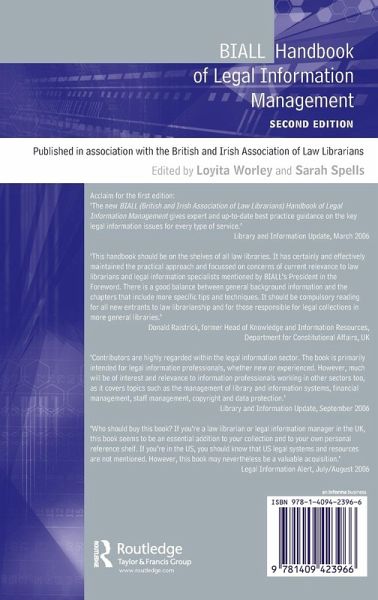 The second edition of this popular handbook has been thoroughly updated by the original team of experts and some new contributors, to provide current best practice guidance on the key legal information issues for every type of service. Each of the chapters is updated to reflect general changes in law libraries and their users in the past seven years. In particular, the handbook covers new information technologies, including social networking and communication. New chapters also focus on the key topics of outsourcing, and the impact of the 2007 Legal Services Act. The second edition of this valuable handbook continues to be an important professional reference tool for managers and staff of all types of legal information services, and will help them with the challenges they face in their work every day.