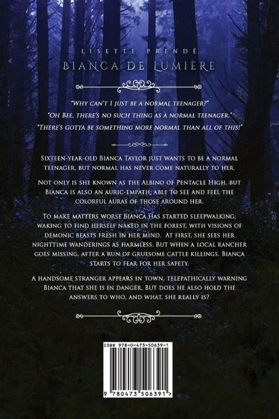 A teenage girl with supernatural powers must trust a handsome telepathic stranger if she is to save her small town from evil and discover her true identity. Sixteen-year-old Bianca Taylor just wants to be a normal teenager but normal has never come naturally to her. Not only is she known as the Albino of Pentacle High, but Bianca is also an auric-empath; able to see and feel the colorful auras of those around her. To make matters worse Bianca has started sleepwalking; waking to find herself naked in the forest, with visions of demonic beasts fresh in her mind. At first, she sees her nighttime wanderings as harmless. But when a local rancher goes missing, after a run of gruesome cattle killings, Bianca starts to fear for her safety. A handsome stranger appears in town, telepathically warning Bianca that she is in danger. But does he also hold the answers to who, and what, she really is? Bianca De Lumiere is a page-turning, young adult novel. It weaves themes of teen bullying, self esteem and feminism into an urban fantasy setting. The story is driven by strong female characters fighting to find and claim their unique power.