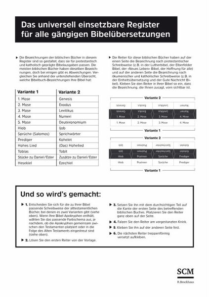 Hiermit kann man jede Bibelstelle viel schneller aufschlagen! Dieses schwarze Bibel-Griffregister zeigt an, wo jedes einzelne biblische Buch beginnt. Enthalten sind auch Register-Reiter für Apokryphen und katholische Bibelbuch-Bezeichnungen, ferner weitere Reiter für verschiedene Studienbibeln. Dieses Bibel-Griffregister kann leicht in die eigene Bibel eingeklebt werden.