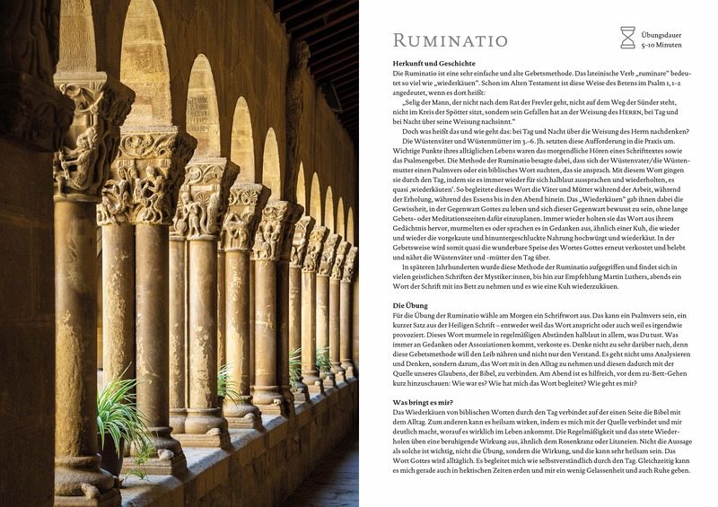 Mit dieser Bibel finden Sie ihre ganz eigene spirituelle Tagesroutine.In dieser hochwertigen Bibelausgabe stellt Bruder Thomas Dienberg 32 einfache Übungen aus der christlich-spirituellen Tradition vor,die sich mühelos in den Alltag integrieren lassen. Ob Morgen- oder Abendroutine, Herzensgebet, Ruherituale, Lectio Divina, Gelassenheitüben, Fasten oder Pilgern im Park - hier können Leser:innen vielekleine Auszeiten ausprobieren. Integriert in einer Bibel mit stimmungsvollen Fotomotiven, lassen sich die Übungen sofort praktisch umsetzen, da für die meisten die Heilige Schrift benötigt wird.Die Bibel in einem größeren Format enthält den vollständigen Textder Einheitsübersetzung mit Einführungen in jedes biblische Buch,Anmerkungen, Verweisstellen und einem Anhang mit Stichwort- undPersonenregister, Zeittafel, Sacherläuterungen und 9 Karten.