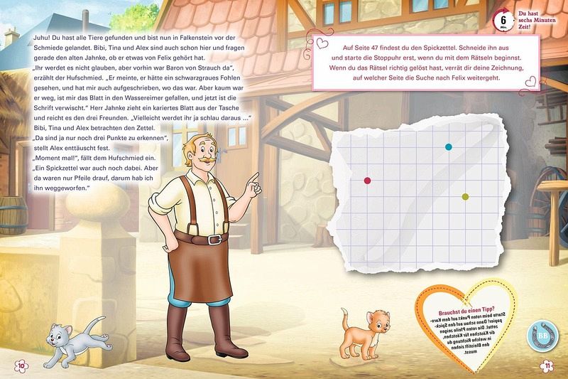 Bibi und Tina machen einen Ausritt mit ihren Pferden Sabrina und Amadeus. Ausnahmsweise darf auch Sabrinas Fohlen Felix mitkommen. Doch plötzlich fehlt von dem neugierigen Felix jede Spur. Oh nein! Ein Fohlen ganz allein unterwegs? Da kann alles Mögliche passieren! Bibi und Tina machen sich sofort auf die Suche nach dem Ausreißer. Doch ihn zu finden, ist gar nicht so einfach. Begleite Bibi und Tina bei diesem spannenden Abenteuer und hilf ihnen, Felix wiederzufinden! Dabei sind kluge Ideen, eine gute Kombinationsgabe und jede Menge Pferdewissen gefragt. Suche nach Hinweisen, knacke verschlüsselte Botschaften und löse knifflige Rätsel - damit Felix wieder wohlbehalten nach Hause zurückkehrt!Ein spannendes Escape-Abenteuer in der Welt von Bibi und Tina!