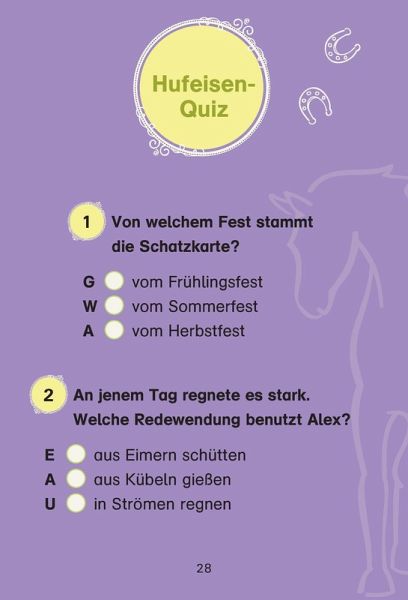Optimal abgestimmt auf das erste Lesevermögen durch ein ausgewogenes Verhältnis von Textmenge und Illustration, angepasster Schriftart, Schriftgröße und ZeilenlängeMit Hufeisen-Quiz zur spielerischen Überprüfung des TextverständnissesDer Bibi-und-Tina-Lesepass spornt zu regelmäßigem Lesen an