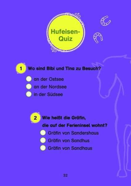 Jede Geschichte ist genau auf das Lesevermögen von Leseanfängern abgestimmtNach dem Prinzip "Lesen-Verstehen-Mitmachen" vervollständigen die kleinen Leser selbst Illustrationen oder den Text der Bibi & Tina-GeschichtenMit Hufeisen-Quiz zur spielerischen Überprüfung des LeseverständnissesEXTRA: In den 10 Extraseiten verraten Bibi und Tina den Pferde-Fans jede Menge Wissenswertes über Pferde, wie z.B. verschiedenen Pferderassen, Reitbekleidung uvm.