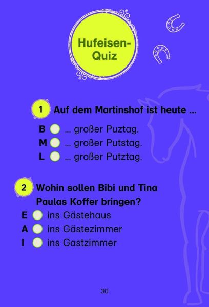 Optimal abgestimmt auf das erste Lesevermögen durch ein ausgewogenes Verhältnis von Textmenge und Illustration, angepasster Schriftart, Schriftgröße und ZeilenlängeMit Hufeisen-Quiz zur spielerischen Überprüfung des TextverständnissesDer Bibi-und-Tina-Lesepass spornt zu regelmäßigem Lesen an