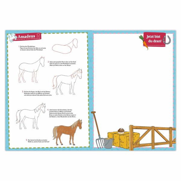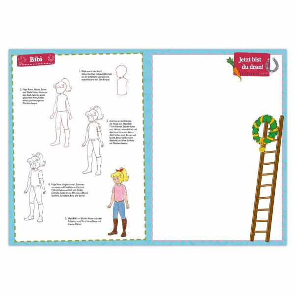 Pferdestarker Zeichenspaß!Ob Amadeus oder Sabrina, das passende Putzzeug und den Sattel, mit dieser Zeichenschule kann jeder Fan von Bibi und Tina die beliebtesten Motive vom Martinshof selbst zeichnen! Aus einfachen Grundelementen wie Kreis, Oval und Rechteck entstehen mit ein wenig Übungen und ein paar Linien die coolsten Bilder.mit Bibi & Tina kinderleicht Zeichnen lernenanschauliche Schritt-für-Schritt-Anleitungenleicht verständliche Erklärungenviel Platz zum Zeichnen und Üben
