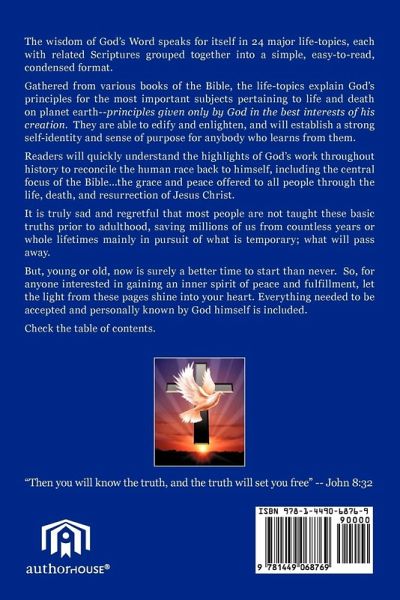 The wisdom of God's Word speaks for itself in 24 major life-topics, each with related Scriptures grouped together into a simple, easy-to-read, condensed format. Gathered from various books of the Bible, the life-topics explain God's principles for the most important subjects pertaining to life and death on planet earth--principles given only by God in the best interests of his creation. They are able to edify and enlighten, and will establish a strong self-identity and sense of purpose for anybody who learns from them. Readers will quickly understand the highlights of God's work throughout history to reconcile the human race back to himself, including the central focus of the Bible...the grace and peace offered to all people through the life, death, and resurrection of Jesus Christ. It is truly sad and regretful that most people are not taught these basic truths prior to adulthood, saving millions of us from countless years or whole lifetimes mainly in pursuit of what is temporary; what will pass away. But, young or old, now is surely a better time to start than never. So, for anyone interested in gaining an inner spirit of peace and fulfillment, let the light from these pages shine into your heart. Everything needed to be accepted and personally known by God himself is included.