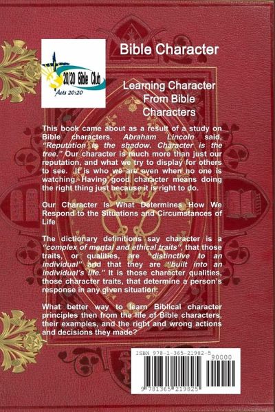 This book came about as a result of a study on Bible characters. Abraham Lincoln said, "Reputation is the shadow. Character is the tree." Our character is much more than just our reputation, and what we try to display for others to see. It is who we are even when no one is watching. Having a Good Character means doing the right thing just because it is right to do. What better way to learn Biblical character principles then from the life of Bible characters, their examples and the right and wrong actions and decisions they made; we can learn from them Biblical truths and traits to apply to our life. We can develop Godly character to use and guide us throughout our life from the examples they have left us in the written record of God's Word.