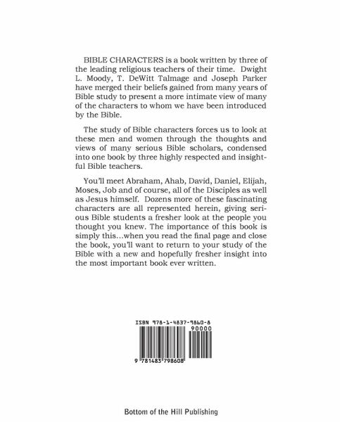 BIBLE CHARACTERS is a book written by three of the leading religious teachers of their time. Dwight L. Moody, T. DeWitt Talmage and Joseph Parker have merged their beliefs gained from many years of Bible study to present a more intimate view of many of the characters to whom we have been introduced by the Bible. The study of Bible characters forces us to look at these men and women through the thoughts and views of many serious Bible scholars, condensed into one book by three highly respected and insightful Bible teachers. You’ll meet Abraham, Ahab, David, Daniel, Elijah, Moses, Job and of course, all of the Disciples as well as Jesus himself. Dozens more of these fascinating characters are all represented herein, giving serious Bible students a fresher look at the people you thought you knew. The importance of this book is simply this…when you read the final page and close the book, you’ll want to return to your study of the Bible with a new and hopefully fresher insight into the most important book ever written.