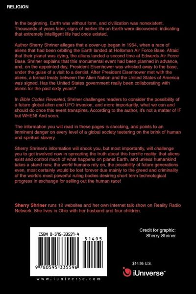 In the beginning, Earth was without form, and civilization was nonexistent. Thousands of years later, signs of earlier life on Earth were discovered, indicating that extremely intelligent life had once existed. Author Sherry Shriner alleges that a cover-up began in 1954, when a race of aliens that had been orbiting the Earth landed at Holloman Air Force Base. Afraid that their planet was dying, the aliens landed a second time at Edwards Air Force Base. Shriner explains that this monumental event had been planned in advance, and, on the appointed day, President Eisenhower was whisked away to the base, under the guise of a visit to a dentist. After President Eisenhower met with the aliens, a formal treaty between the Alien Nation and the United States of America was signed. Has the United States government really been collaborating with aliens for the past sixty years? In Bible Codes Revealed, Shriner challenges readers to consider the possibility of a future global alien and UFO invasion, and more importantly, what we can and should do once this event transpires. According to the author, it's not a matter of IF but WHEN! And soon. The information you will read in these pages is shocking, and points to an imminent danger on every level of a global society teetering on the brink of human and spiritual slavery. Sherry Shriner's information will shock you, but most importantly, will challenge you to get involved now in spreading the truth about this horrific reality: that aliens exist and control much of what happens on planet Earth, and unless humankind takes a stand now, the world humans rely on, the possibility of future generations even, most certainly would be lost forever due mainly to the greed and criminality of the world's most powerful ruling bodies desiring short term technological progress in exchange for selling out the human race!