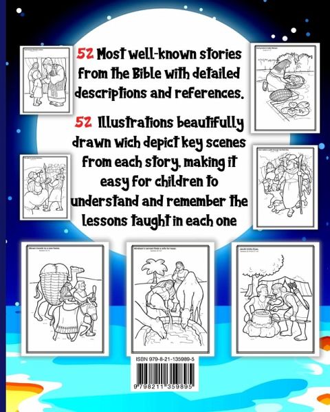 This is a beautifully illustrated coloring book that contains 52 of the most important stories from the Bible. Each story is accompanied by a unique drawing to color and an exact description, including the part of the Bible where the story can be found. These are some of the benefits of this coloring book: Learning the stories of the Bible: The book contains 52 of the most important stories of the Bible, allowing children to learn and understand the important messages and values of the Bible. This can help them develop a deeper understanding of their faith and the world around them. Encouraging creativity: Coloring is a great way to encourage creativity and self-expression in children. With unique illustrations to color, children can let their imagination run wild and create their own interpretations of the stories they read. Developing fine motor skills: Coloring is a fun way for children to develop their fine motor skills, such as hand-eye coordination and finger dexterity. This can be especially beneficial for younger children who are still developing these skills. Strengthening family bonds: This book can be a great tool for families to spend time together, exploring the stories of the Bible and creating beautiful art together. This can help strengthen family bonds and provide a fun and meaningful activity for everyone to enjoy.