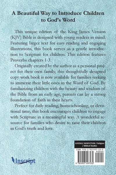A Beautiful Way to Introduce Children to God's Word This unique edition of the King James Version (KJV) Bible is designed with young readers in mind. Featuring larger text for easy reading and engaging illustrations, this book serves as a gentle introduction to Scripture for children. This edition features Proverbs chapters 1-3. Originally created by the author as a personal project for their own family, this thoughtfully designed copy work book is now available for families seeking to immerse their little ones in the Word of God. By familiarizing children with the beauty and wisdom of the Bible from an early age, parents can lay a strong foundation of faith in their hearts. Perfect for daily reading, homeschooling, or devotional time, this book encourages children to engage with Scripture in a meaningful way. A wonderful resource for families who desire to raise their children in God's truth and love.