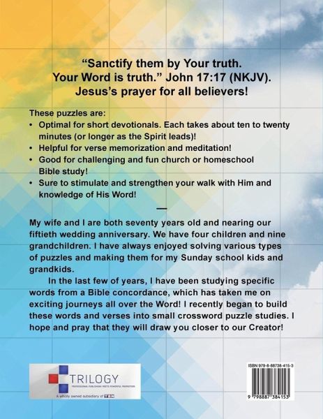 "Sanctify them by Your truth. Your Word is truth." John 17:17 (NKJV).Jesus's prayer for all believers! These puzzles are:Optimal for short devotionals. Each takes about ten to twenty minutes (or longer as the Spirit leads)! Helpful for verse memorization and meditation! Good for challenging and fun church or homeschool Bible study! Sure to stimulate and strengthen your walk with Him and knowledge of His Word!