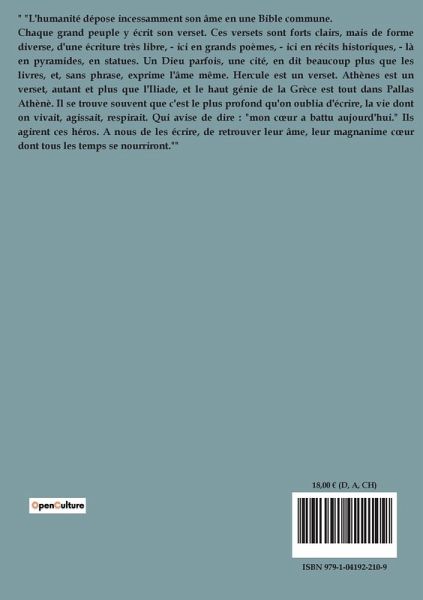 " "L'humanité dépose incessamment son âme en une Bible commune. Chaque grand peuple y écrit son verset. Ces versets sont forts clairs, mais de forme diverse, d'une écriture très libre, - ici en grands poèmes, - ici en récits historiques, - là en pyramides, en statues. Un Dieu parfois, une cité, en dit beaucoup plus que les livres, et, sans phrase, exprime l'âme même. Hercule est un verset. Athènes est un verset, autant et plus que l'Iliade, et le haut génie de la Grèce est tout dans Pallas Athènè. Il se trouve souvent que c'est le plus profond qu'on oublia d'écrire, la vie dont on vivait, agissait, respirait. Qui avise de dire : "mon c¿ur a battu aujourd'hui." Ils agirent ces héros. A nous de les écrire, de retrouver leur âme, leur magnanime c¿ur dont tous les temps se nourriront.""