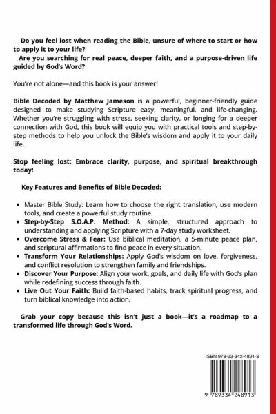 ¿Have you ever wanted to study the Bible but felt overwhelmed about where to start?¿Do you long for clarity, peace, and purpose but struggle to apply God's Word to your daily life?Look No Further!Introducing "Bible Decoded: A Guide to Understanding Scriptures and Applying GOD'S Word to Overcome Stress, Build Relationships, and Find Purpose in Today's World" by Matthew Jameson-the ultimate beginner-friendly Bible study guide designed for modern believers.Whether you're new to Bible study or looking for a structured and engaging approach, this spiritual awakening book simplifies the process with practical tools, step-by-step methods, and biblical insights to help you deepen your faith, strengthen relationships, and find peace.¿Features of "Bible Decoded":Bible Made Simple: This chapter breaks down the relevance of the Bible in today's world, how to choose the right translation, and the importance of using modern tools like Bible apps. It also addresses common obstacles to Bible study and provides tips for creating a sacred study space for a more effective experience. S.O.A.P. Bible Study Method: A step-by-step guide to the S.O.A.P. method (Scripture, Observation, Application, and Prayer), making Bible study structured and meaningful. Includes a 7-day study worksheet, real-life examples and much more. Finding Peace in an Age of Stress: This section explores how stress and anxiety have become modern-day struggles and how biblical meditation, prayer, and scripture application offer real solutions. It provides a 5-minute peace plan, a daily scripture meditation challenge, and real-life testimonies of those who have found peace through God's Word. Building Stronger Relationships Through Scripture: Learn how forgiveness, love, and biblical wisdom can strengthen relationships with family, friends, and colleagues. This chapter provides practical steps for conflict resolution, strengthening family bonds, and keeping a reflection journal for tracking forgiveness and relationship growth. Discovering Purpose in Your Work and Life: Find clarity and direction by uncovering God's blueprint for purposeful living. This chapter helps redefine success through scripture, provides guidance on career changes, and outlines small but powerful steps to aligning your daily life with God's plan. Overcoming Fear and Doubt with God's Promise: This chapter provides scriptural strategies for developing courage, strengthening faith, and overcoming uncertainty. Deepening Your Faith with Bible Study Tools: We have added advanced study techniques like verse mapping, thematic Bible study, and journaling. This chapter includes engaging interactive exercises to grow spiritually.