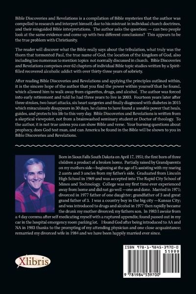 Bible Discoveries and Revelations is a compilation of Bible mysteries that the author was compelled to research and interpret himself, due to his mistrust in individual church doctrines and their misguided Bible interpretations. The author asks the question: can two people look at the same evidence and come up with two different conclusions? This appears to be the true problem with Christianity. The reader will discover what the Bible really says about the tribulation, what truly was the thorn that tormented Paul, the true name of God, the location of the kingdom of God, also including too-numerous-to-mention topics not normally discussed in church. Bible Discoveries and Revelations comprises over sixty-two chapters of individual Bible topic studies written by a spirit-filled recovered alcoholic addict with over thirty-three years of sobriety. After reading Bible Discoveries and Revelations and applying the principles outlined within, it is the sincere hope of the author that you find the power within yourself that he found, which allowed him to walk away from cigarettes, drugs, and alcohol. The author was forced into early retirement and told he had three years to live in 2003. Fourteen years later after three strokes, two heart attacks, six heart surgeries, and finally diagnosed with diabetes in 2015which miraculously disappears in thirty dayshe claims to have found a useable power that heals, guides, and protects his life to this very day. Bible Discoveries and Revelations is written from a skeptical viewpoint, not from a brainwashed seminary student or doctor of theology. To the author, it is not true unless you can show Bible and verse. Your burning questions about prophecy, does God test man, and can America be found in the Bible will be shown to you in Bible Discoveries and Revelations.