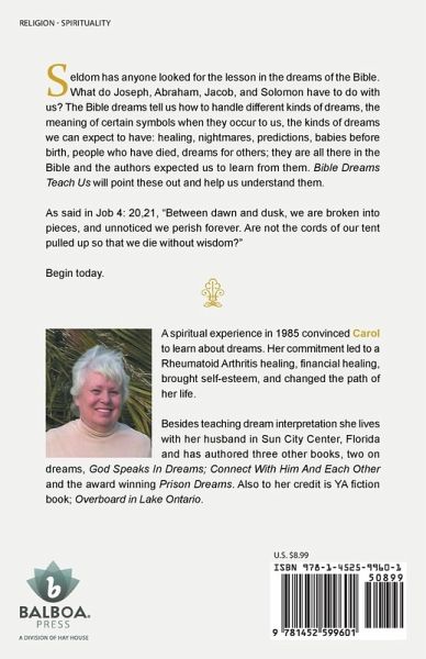 Seldom has anyone looked for the lesson in the dreams of the Bible. What do Joseph, Abraham, Jacob, and Solomon have to do with us? The Bible dreams tell us how to handle different kinds of dreams, the meaning of certain symbols when they occur to us, the kinds of dreams we can expect to have: healing, nightmares, predictions, babies before birth, people who have died, dreams for others; they are all there in the Bible and the authors expected us to learn from them. Bible Dreams Teach Us will point these out and help us understand them. As said in Job 4: 20,21, "Between dawn and dusk, we are broken into pieces, and unnoticed we perish forever. Are not the cords of our tent pulled up so that we die without wisdom?" Begin today.