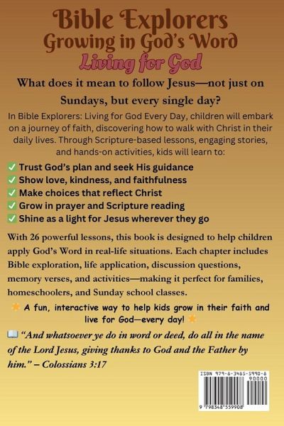 Bible Explorers: Growing in God's WordLiving For God Every Day Help Your Child Grow in Faith and Live for God-Every Day! What does it mean to follow Jesus in everyday life? How can children learn to trust God, make wise choices, and shine His light in all they do? Bible Explorers: Living for God Every Day is an engaging, Scripture-based devotional designed to help kids apply God's Word in real-life situations. This book features 26 powerful lessons covering key biblical truths, including: ✅ Trusting God's Plan - Learning to seek His guidance in daily decisions ✅ Standing Firm in Faith - Following Christ, even when it's difficult ✅ Showing Kindness and Love - Living out the fruit of the Spirit ✅ Making Wise Choices - Honoring God in thoughts, words, and actions ✅ Living with Purpose - Understanding how to glorify God in all things Each chapter includes: ���� Bible Exploration - A key Scripture passage and biblical insights ���� Life Application - Practical ways to live out faith daily ���� Discussion & Reflection - Thought-provoking questions for deeper learning ✍ Challenge Activity - Fun writing exercises to reinforce biblical truths ���� Fill-in-the-Blank Memory Verse - A hands-on way to help kids learn Scripture Perfect for families, homeschoolers, and Sunday school classes, this interactive book will equip children with a strong foundation in faith while encouraging them to live for God every day! ���� A fun and engaging way to help kids grow closer to God and walk in His ways! ���� ���� "And whatsoever ye do in word or deed, do all in the name of the Lord Jesus, giving thanks to God and the Father by him." - Colossians 3:17