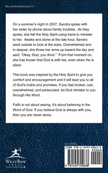 One night in August 2007, I was on the phone talking to Irene, my sister, about my family troubles. The Holy Spirit used Irene to minister to me. Arthur, my husband, was already in bed and I went outside to look at the stars. I threw my arms up towards the sky and said, "O.K. God, you drive." Since then, I have known that God is with me even when He is silent. I was inspired by the Holy Spirit to write this book for you for comfort and encouragement. I know what it is like to feel broken, lost and persecuted. Let God minister to you through His Word. Remember, faith is not about seeing, it's about believing, believing in the Word of God. If you believe God is always with you, then you are never alone.