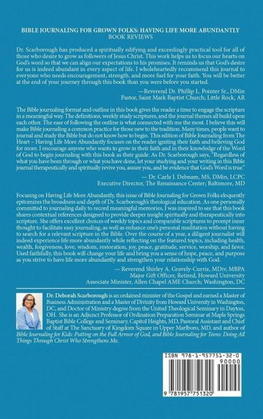 BIBLE JOURNALING FOR GROWN FOLKS: Having Life More Abundantly! is designed as a therapeutic reflective tool to help you grow in the faith by systematically studying God's Word. Christianity Today confirms this premise and this work in the article excerpt below: "Spending time in Bible reflection is hands down the highest impact personal spiritual practice. There's great significance in the word reflection. It implies a contemplative process, one of thoughtful and careful deliberation. This is not about skimming through a Bible passage or devotional. It is thoughtful, personal meditation that catalyzes spiritual growth." This work is the third edition of Reverend Dr. Deborah Scarborough's family Bible journal series. My first work, entitled Bible Journaling for Kids, Putting on the Full Armor of God, is based on Ephesians 4:11-18. My second work, entitled Bible Journaling for Teens, Doing All Things Through Christ Who Strengthens Me, is based on xii Philippians 4:13. And now it's your turn! It's your time! Time for you to get on board with Bible journaling!
