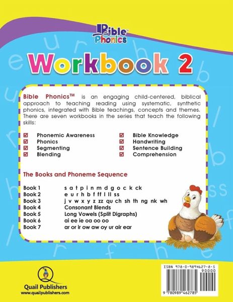 Bible Phonics is a unique series of workbooks where children learn the relationships between letters (graphemes) of our written language and spoken language's sounds (phonemes). This is integrated with the Bible teachings, concepts, and themes. The letters, s, a, t, and p, are introduced first. Each letter has a connected Bible story to further promote Christian teachings and letter-sound knowledge. The workbooks are ideal for children's Bible classes, Christian schools, churches, and homeschoolers. There are two pages dedicated to teaching each sound. These fully reproducible sheets contain engaging activities that promote the following:Phonemic Awareness: Identify sounds in spoken words Phonics: Understand letter-sound correspondences Handwriting: Write the letters that represent each sound Spelling: Use picture clues to spell words with the target sound, and identify the correct spelling of words with the target sound Reading: Read simple sentences with the target sound Write: Write sentences with the target sound Comprehension: Listen to a connected Bible story that supports the sound being taught. Answer questions asked about the story.