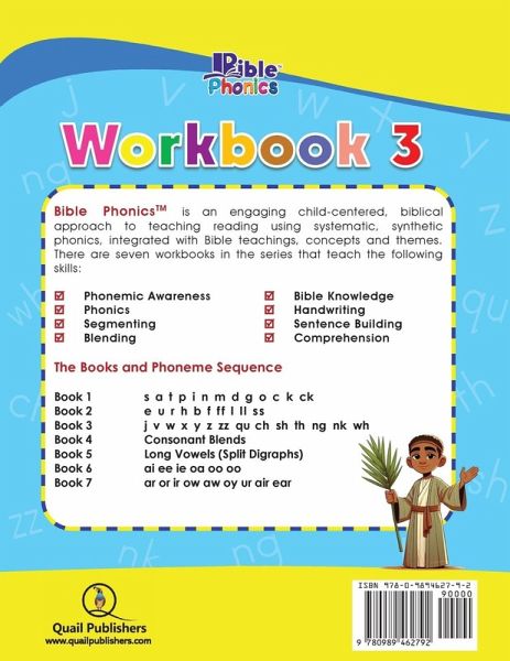Bible Phonics is a unique series of workbooks where children learn the relationships between letters (graphemes) of our written language and spoken language's sounds (phonemes). This is integrated with the Bible teachings, concepts, and themes. The workbooks are ideal for children's Bible classes, Christian schools, churches, and homeschoolers. There are two pages dedicated to teaching each sound. These fully reproducible sheets contain engaging activities that promote the following:Phonemic Awareness: Identify sounds in spoken words Phonics: Understand letter-sound correspondences Handwriting: Write the letters that represent each sound Spelling: Use picture clues to spell words with the target sound, and identify the correct spelling of words with the target sound Reading: Read simple sentences with the target sound Writing: Write sentences with the target sound Comprehension: Listen to a connected Bible story that supports the sound being taught. Answer questions asked about the story.