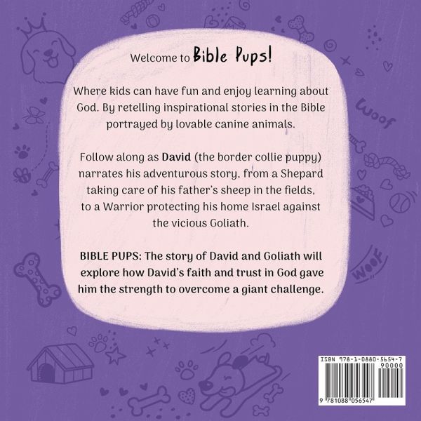 Welcome to BIBLE PUPS! Where kids can have fun and enjoy learning about God. By retelling inspirational stories in the Bible portrayed by lovable canine animal friends. Follow along as David the border collie puppy narrates his adventurous story, from a Shepard tending and protecting his father's sheep in the fields. To David becoming a Warrior and protecting his home Israel against the vicious Goliath. Many doubted and mocked David for wanting to battle the Mighty Goliath. Even though David was small, his heart for God was bigger. BIBLE PUPS: The Story of David and Goliath will explore how David's faith and trust in God gave him the strength to overcome a giant challenge.