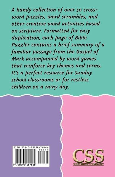 A handy collection of over 50 crossword puzzles, word scrambles, and other creative word activities based on scripture. Formatted for easy duplication, each page of Bible Puzzler contains a brief summary of a familiar passage from the Gospel of Mark accompanied by word games that reinforce key themes and terms. It's a perfect resource for Sunday school classrooms or for restless children on a rainy day.