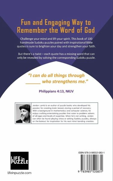 "I can do all things through ______ who strengthens me." - Philippians 4:13, NKJV Looking for a unique and uplifting way to challenge your mind and lift your spirit? Then you need this amazing book of Sudoku puzzles and Bible quotes that are sure to brighten your day and strengthen your faith! Each quote is carefully chosen to inspire and motivate you on your journey, and our handmade, unique Sudoku puzzles are expertly designed to keep you engaged and entertained. But there's a twist - each quote has a missing word that can only be revealed by solving the corresponding Sudoku puzzle. The perfect way to take a moment to reflect and rejuvenate after a busy day. 100 Handmade Sudoku puzzles ranging from easy to challenging -- you'll never be bored. A collection of the most inspiring bible quotes -- memorize and recall scripture with confidence. The perfect gift for any occasion, whether it's Mother's Day, Father's Day, birthday, anniversary, Christmas stocking stuffer, or even just because. Whether you're solving puzzles in this book in your free time or using the quotes as part of your daily devotions, you're sure to find something to inspire and motivate you in this book. And who knows, maybe you'll even discover a new favorite bible verse along the way.