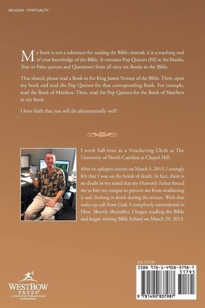 My book is not a substitute for reading the Bible; instead, it is a teaching tool of your knowledge of the Bible. It contains Pop Quizzes (Fill in the blanks, True or False quizzes and Questions) from all sixty-six Books in the Bible. That shared, please read a Book in the King James Version of the Bible. Then, open my book and read the Pop Quizzes for that corresponding Book. For example, read the Book of Matthew. Then, read the Pop Quizzes for the Book of Matthew in my book. I have faith that you will do phenomenally well!