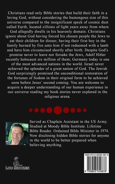 Christians read only Bible stories that build their faith in a loving God, without considering the humongous size of this universe compared to the insignificant speck of cosmic dust called Earth, located zillions of light years away from where God allegedly dwells in his heavenly domain. Christians ignore about God having forced his chosen people the Jews to eat their children for dinner, having their first boy in the family burned by fire unto him if not redeemed with a lamb and have him circumcised shortly after birth. Despite God's promise never to leave nor forsake the Jews, Adolf Hitler recently holocaust six million of them; Germany today is one of the most advanced nations in the world. Israel never achieved the splendor of a great nation of God. The Jewish God surprisingly promised the unconditional restoration of the fortunes of Sodom in their original form to be achieved soon before Jesus' second coming. You are welcome to acquire a deeper understanding of our human experience in our universe reading my book stories never explored in the religious arena.