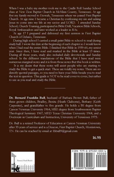 When I was a baby my mother took me to the Cradle Roll Sunday School class at New Zion Baptist Church in McMinn County, Tennessee. At age five my family moved to Etowah, Tennessee where we joined First Baptist Church. At age nine I became a Christian by confessing my sin and asking Jesus to come into my life as my savior and LORD. I attended Sunday School, Church Training, participated in Bible Drill, Vacation Bible Schools, Royal Ambassadors and later worked as a leader in RAs. At age 17 I prepared and delivered my first sermon in First Baptist Church of Delano, Tennessee. During high school I carried a small print Bible to school to read during study hall. I wrote the date at the beginning of each chapter so I would know when I had read the entire Bible. I finished that Bible in 1959-60, my senior year. Since then, I have read and marked in the Bible at least 13 times. During all those years, study also included daily devotionals and Sunday school. In the different translations of the Bible that I have read were numerous marginal notes and it is from those notes that this book is written. It is my desire that these notes will assist people who are starting to study the Bible to get a quick start. These are totally my notes. There are no directly quoted passages, so you need to have your Bible beside you to read the text in question. This guide is NOT to be read cover to cover, but rather to use as you read and study the Bible. _____________ Dr. Bernard Franklin Bull, husband of Barbara Brown Bull; father of three grown children, Bradley, Benita (Heath Claiborne), Bethany (Keith Carpenter), and grandfather to five grands. He holds a BS degree from Carson Newman University 1964; MRE degree from Southwestern Baptist Theological Seminary 1967; MED Texas Christian University 1968, and a Doctorate in Curriculum and Instruction, University of Tennessee 1975. Dr. Bull is a retired Professor of Education at Carson Newman University after 35 years of service and is a Deacon, First Baptist Church, Morristown, TN. He can be reached by email at 1bbull9@gmail.com