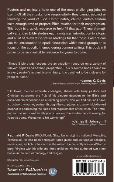 Pastors and ministers have one of the most challenging jobs on Earth. Of all their tasks, one responsibility they cannot neglect is teaching the word of God. Unfortunately, church leaders seldom have enough time to prepare Bible studies for their congregation. This book is a quick resource to help fill that gap. These thematically arranged Bible studies each contain an introduction to a topic and a list of relevant Scripture readings for that topic. Pastors can use the introduction to spark discussion within small groups or to focus on the specific themes during sermon writing. This book will prove to be an invaluable resource for years to come.
