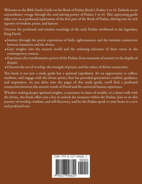 Welcome to the Bible Study Guide on the Book of Psalms Book I, Psalms 1 to 41. Embark on an extraordinary voyage through the soul-stirring poetry of Psalms 1 to 41. This captivating guide takes you on a profound exploration of the first part of the Book of Psalms, delving into its rich tapestry of wisdom, praise, and lament. Uncover the profound and timeless teachings of the early Psalms attributed to the legendary King David. Journey through the poetic expressions of faith, righteousness, and the intimate connection between humanity and the divine. Gain insights into the ancient world and the enduring relevance of these verses in the contemporary context. Experience the transformative power of the Psalms, from moments of serenity to the depths of despair. Discover the art of worship, the strength of prayer, and the solace of divine connection. This book is not just a study guide but a spiritual expedition. It's an opportunity to reflect, meditate, and engage with the divine poetry that has provided generations comfort, guidance, and inspiration. As you delve into the pages of this study guide, you'll find a profound connection between the ancient words of David and the universal human experience. Whether seeking deeper spiritual insights, a sanctuary in times of trouble, or a closer walk with the divine, this book offers you a key to unlock the treasures within the Psalms. Join us on this journey of worship, wisdom, and self-discovery, and let the Psalms speak to your heart in a new and profound way.