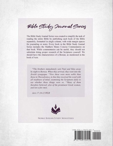 The Bible Study Journal Series was created to simplify the task of reading the entire Bible by publishing each book of the Bible separately as study journals, formatted in a single column, with wide margin spaces for journaling or taking notes. Every book in the Bible Study Journal Series includes the Matthew Henry Concise Commentaries on that book. While commentaries can be useful, they should not substitute doing proper research of the Scriptures yourself. As Christians, we should take on the characteristics of a Berean, as mentioned in the book of Acts 17:10-12. Bible reading and Bible…mehr
