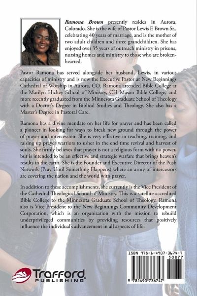 Ramona Brown presently resides in Aurora, Colorado. She is the wife of Pastor Lewis F. Brown Sr., celebrating 40 years of marriage, and is the mother of two adult children and three grandchildren. She has enjoyed over 35 years of outreach ministry in prisons, nursing homes and ministry to those who are brokenhearted.