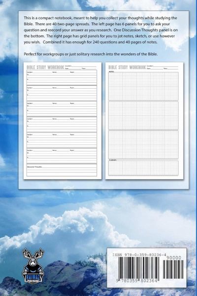 This is a compact notebook, meant to help you collect your thoughts while studying the Bible. There are 80 two-page spreads. The left page has 6 panels for you to ask your question and record your answer as you research. One Discussion Thoughts panel is on the bottom. The right page has grid panels for you to jot notes, sketch, or use however you wish. Combined it has enough for 480 questions and 80 pages of notes. Perfect for workgroups or just solitary research into the wonders of the Bible.