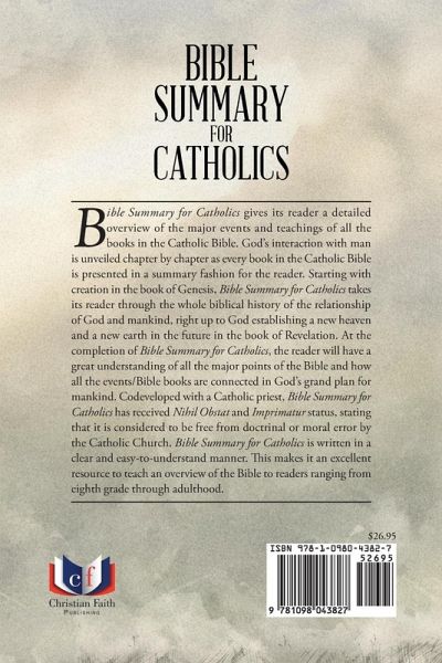 Bible Summary for Catholics gives its reader a detailed overview of the major events and teachings of all the books in the Catholic Bible. God's interaction with man is unveiled chapter by chapter as every book in the Catholic Bible is presented in a summary fashion for the reader. Starting with creation in the book of Genesis, Bible Summary for Catholics takes its reader through the whole biblical history of the relationship of God and mankind, right up to God establishing a new heaven and a new earth in the future in the book of Revelation. At the completion of Bible Summary for Catholics, the reader will have a great understanding of all the major points of the Bible and how all the events/Bible books are connected in God's grand plan for mankind. Codeveloped with a Catholic priest, Bible Summary for Catholics has received Nihil Obstat and Imprimatur status, stating that it is considered to be free from doctrinal or moral error by the Catholic Church. Bible Summary for Catholics is written in a clear and easy-to-understand manner. This makes it an excellent resource to teach an overview of the Bible to readers ranging from eighth grade through adulthood.