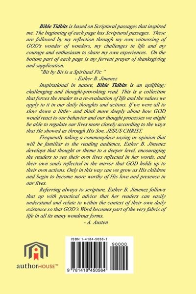 Bible Tidbits are based on Scriptural Passages that inspired me. The beginning of each page has Scriptural Passages. Then followed by my reflection through my own witnessing of GOD's wonder of wonders, my challenges in life and my courage and enthusiasm to share my own experiences. In the bottom part of each page is my fervent prayer of thanksgiving and supplication. "Bit by Bit is a Spiritual Fit:" - Esther B. Jimenez Inspirational in nature, Bible Tidbits are an uplifting; challenging and thought- provoking read. This is a collection that forces the reader to a re-evaluation of life and the values we apply to it in our daily thoughts and actions. If we were all to slow down a little~ and think more deeply about how GOD would react to our behavior and our thought processes we might be able to regulate our lives more closely according to the ways that He showed us through His Son, JESUS CHRIST Frequently taking a commonplace saying or opinion that will be familiar to the reading audience, Esther B. Jimenez develops that thought or theme to a deeper level, encouraging the reader to see their own life reflected in her words, and their own soul reflected in the mirror that GOD holds up to our own actions. Only in this way can we grow as His children and begin to become more worthy of His love and presence in our lives. Referring always to Bible scripture, Esther B. Jimenez follows that up with practical advice that her readers can easily understand and relate to within the context of their own daily existence so that GOD's Word becomes part of the very fabric of life in all its many wondrous forms. - A. Austen