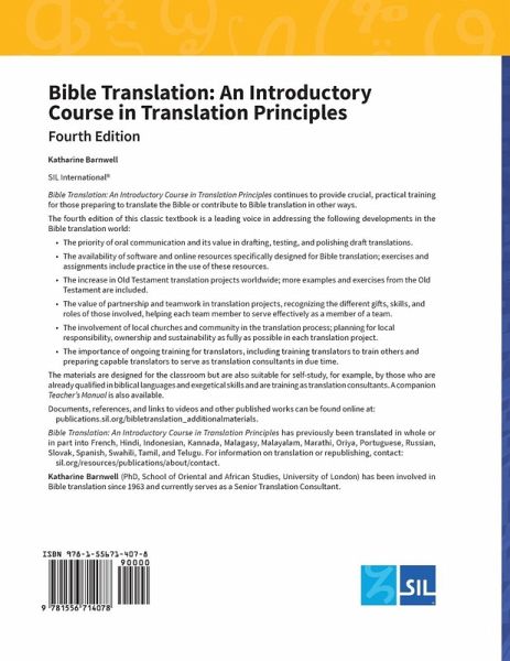 Bible Translation: An Introductory Course in Translation Principles continues to provide crucial, practical training for those preparing to translate the Bible or contribute to Bible translation in other ways. The fourth edition of this classic textbook is a leading voice in addressing the following developments in the Bible translation world: The priority of oral communication and its value in drafting, testing, and polishing draft translations. The availability of software and online resources specifically designed for Bible translation; exercises and assignments include practice in the use of these resources. The increase in Old Testament translation projects worldwide; more examples and exercises from the Old Testament are included. The value of partnership and teamwork in translation projects, recognizing the different gifts, skills, and roles of those involved, helping each team member to serve effectively as a member of a team. The involvement of local churches and community in the translation process; planning for local responsibility, ownership and sustainability as fully as possible in each translation project. The importance of ongoing training for translators, including training translators to train others and preparing capable translators to serve as translation consultants in due time. The materials are designed for the classroom but are also suitable for self-study, for example, by those who are already qualified in biblical languages and exegetical skills and are training as translation consultants. A companion Teacher’s Manual is also available. Documents, references, and links to videos and other published works can be found online at: publications.sil.org/bibletranslation_additionalmaterials. Bible Translation: An Introductory Course in Translation Principles has previously been translated in whole or in part into French, Hindi, Indonesian, Kannada, Malagasy, Malayalam, Marathi, Oriya, Portuguese, Russian, Slovak, Spanish, Swahili, Tamil, and Telugu. For information on translation or repbublishing, contact: sil.org/resources/publications/about/contact.