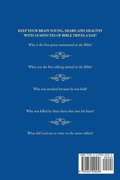 Do you think you know everything about the Bible? Well, think again. If you're looking for a book that will challenge your knowledge of the Bible and will help you surprise others with your knowledge of the Word of the Lord! Test your brainpower with exciting easy to hard trivia questions that you can enjoy with your family and friends! In Bible Trivia for Adults and Seniors, you will:Enjoy over 390 mind-juggling Bible Trivia questions! Find 21 highly organized categories. Easily find the answers on the next page of the questions, plus the scripture where you can locate it, just in case you want to look it up. Learn fun facts and interesting details about the Bible along the way! Find a fun activity that improves your long-term memory, working memory, executive functioning, processing speed, and so much more. Find the perfect gift for your family and loved ones. Have the best companion for your Bible study! Ready for a great brain workout? Click the 'add to cart' button and get a copy of this great book today!