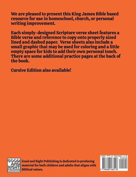 Each of these simply-designed Scripture verse sheets features a King James Bible verse and reference to copy onto properly sized lined and dashed paper. Verse pages also include a small graphic that may be used for coloring and a little empty space for kids to add their own personal touch. There are some additional practice pages at the back of the book.52 Scripture verses about hope, joy, mercy, and peace taken from the KJV Verses from both Old and New Testaments Three to four lines per verse Lined and dashed paper for copying Additional practice sheets Perfect for use in homeschool, Sunday school, or personal improvement! This version is the print edition.
