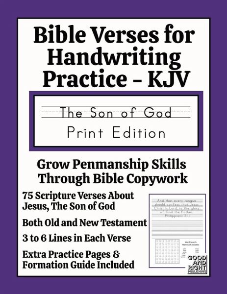 Each simply-designed Scripture verse sheet features a Bible verse and reference to copy onto properly sized lined and dashed paper as well as a fun activity on the bottom - coloring, mazes, and word games. There are also some additional practice pages and a letter formation guide.75 Scripture verses about Jesus, the Son of God Verses from both Old and New Testaments Three to six lines per verse Lined and dashed area for copying (3/8" ruling) Additional practice sheets Letter formation guide Activity on each page Perfect for use in homeschool, Sunday school, or personal improvement! This version is the print version. A cursive version is also available. Suitable for third through fifth grades.