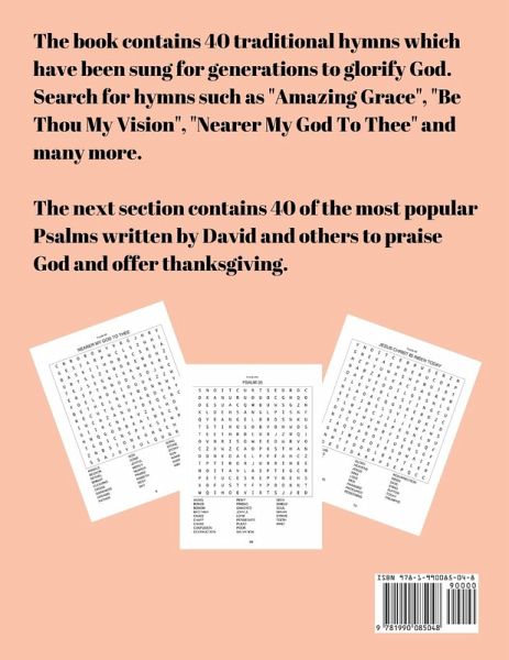 Christian Bible word search puzzle book which can be enjoyed by all ages If you love word search puzzles and the Bible, you will love this book. The book contains 40 traditional hymns which have been sung for generations to glorify God. Search for hymns such as "Amazing Grace", "Be Thou My Vision", "Nearer My God To Thee" and many more. The next section contains 40 of the most popular Psalms written by David and others to praise God and offer thanksgiving. The King James Version translation was used for the Psalms. Large print lettering has been used throughout the book. As a result, this puzzle book can also be enjoyed by seniors or people with eyesight issues. It is a wonderful gift for Christians of any age from children, teens, parents or grandparents. Features:40 cherished Christian hymns 40 of the most popular Psalms King James Version Psalms word search Soft, glossy cover Paperback Spacious 8.5" x 11" size One puzzle per page Large font Solutions provided at the end of each section