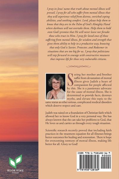 I pray in Jesus' name that truth about mental illness will prevail. I pray for all who suffer from mental illness that they will experience relief from distress, enriched coping abilities, and soothing comfort. Lord, please help them to know that they are in the Palm of God's Almighty Hand where darkness will not overtake them. Help them to hold onto God's promise that He will never leave nor forsake those who trust in Him. I pray for loved ones of those suffering from mental illness, for wisdom and strength that gives them ability to help in a productive way, knowing that only God is Savior, Protector, and Redeemer in situations that are too big for us. I pray that politicians will step forward in courage with constructive measures that improve life for these very vulnerable citizens.