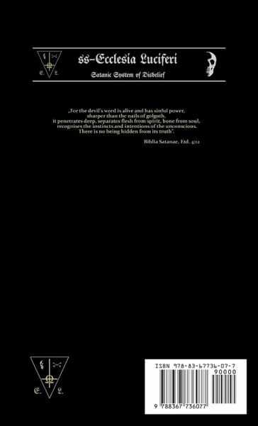 Biblia Satanae. The Satanic Book of the Way, and the Truth, and Abundant Life. Biblia Satanae, not by an imaginary deity, but by Man, is inspired, useful for satanic teaching, for detecting theistic superstition, for educating in godlessness, for proclaiming the good news about the Antichrist, who has revealed Himself to free from belief in an imaginary god, from fear of death and divine fire, from guilt for sin that never was, from belief in eternal life on one's knees. So that the Satanist would be perfect, for a life abundant in flesh and blood prepared. "And every spirit who does not…mehr