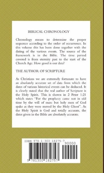 Chronology means to determine the proper sequence according to the order of occurrence. In this volume this has been done together with the dating of the various events. The source of the framework is in the Bible. The time period covered is from eternity past to the start of the Church Age. How good is our data? THE AUTHOR OF SCRIPTURE As Christians we are extremely fortunate to have an absolutely accurate set of data from which the dates of various historical events can be deduced. It is clearly stated that the real author of Scripture is the Holy Spirit. This is shown in 2 Peter 1:21 which states "For the prophecy came not in old time by the will of man: but holy men of God spake as they were moved by the Holy Ghost". As the Holy Spirit is God and totally accurate, the dates given in the Bible are absolutely accurate.