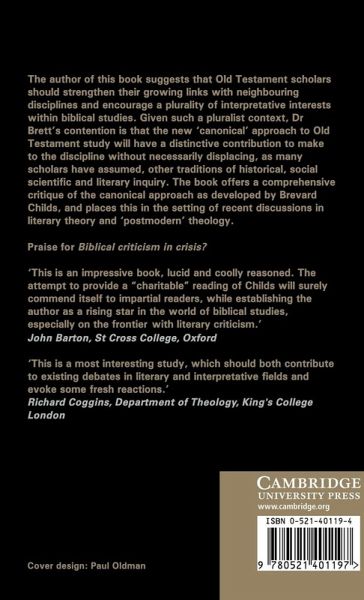 This book suggests that Old Testament scholars should strengthen their growing links with neighbouring academic disciplines and encourage a number of interpretative interests within biblical studies. Given such a pluralistic context, the author's contention is that the new 'canonical' approach to Old Testament study will have a distinctive contribution to make to the discipline without necessarily displacing other traditions of historical and literary inquiry, as many scholars have assumed. Dr Brett offers a comprehensive critique of the canonical approach as developed by Brevard Childs, and examines the development of Childs's exegetical practice, his hermeneutical theory, and the many critical responses which his work has elicited. In responding to these criticisms, the author examines the most problematic aspects of the canonical approach (notably Childs's inadequate reply to those who emphasise the ideological conflicts that lie behind biblical texts in their final form) and seeks to reconstruct the approach in light of contemporary discussions of interpretation in literary theory and the social sciences.